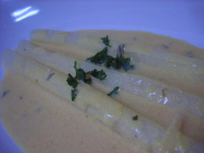 中でも、シンプルな「ゆでた白アスパラに濃い目のソースを浸してる」1品は