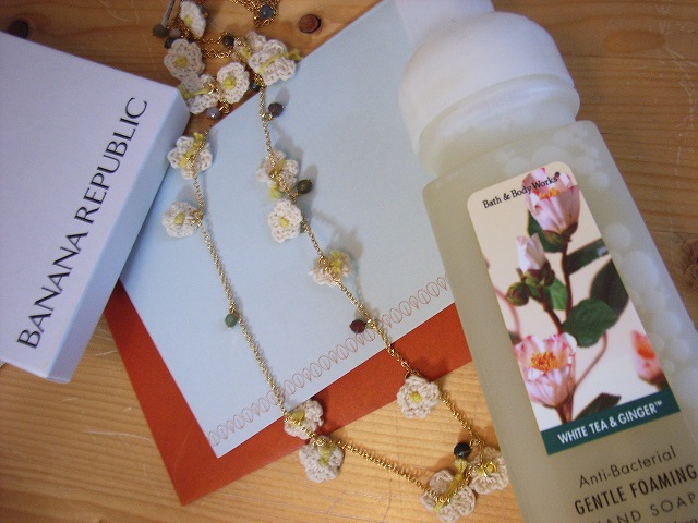 ネックレスは、小さく編んだお花とビーズが連なってるの。