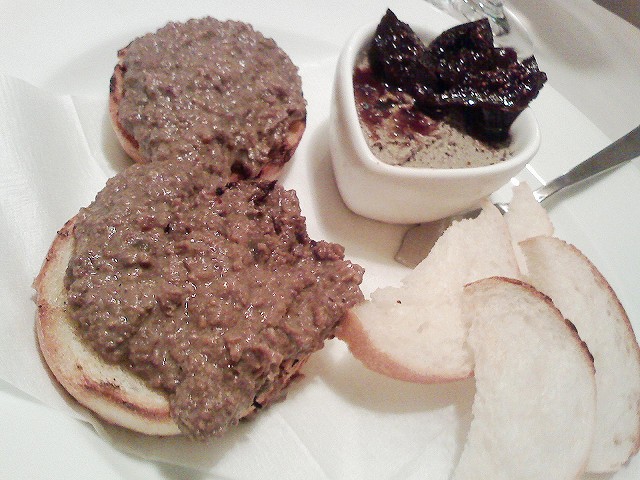 前菜のひとつ。暖かいのと冷たいパテ。ワインが飲みたくなります(笑)