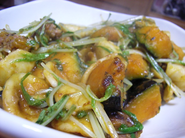かぼちゃを使った黒酢和えのパスタを作ってみました。